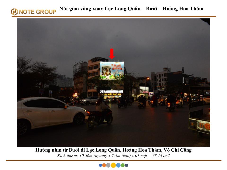 Billboard tọa lạc tại vòng xoay Lạc Long Quân – Bưởi – Hoàng Hoa Thám, điểm giao cắt quan trọng kết nối các quận Tây Hồ, Ba Đình và Cầu Giấy.