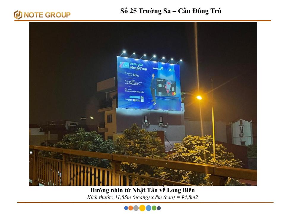 Bảng quảng cáo tọa lạc tại số 25 đường Trường Sa, ngay chân cầu Đông Trù – trục giao thông huyết mạch nối trung tâm Hà Nội với các quận Long Biên, Đông Anh và các tỉnh khu vực Đông Bắc.