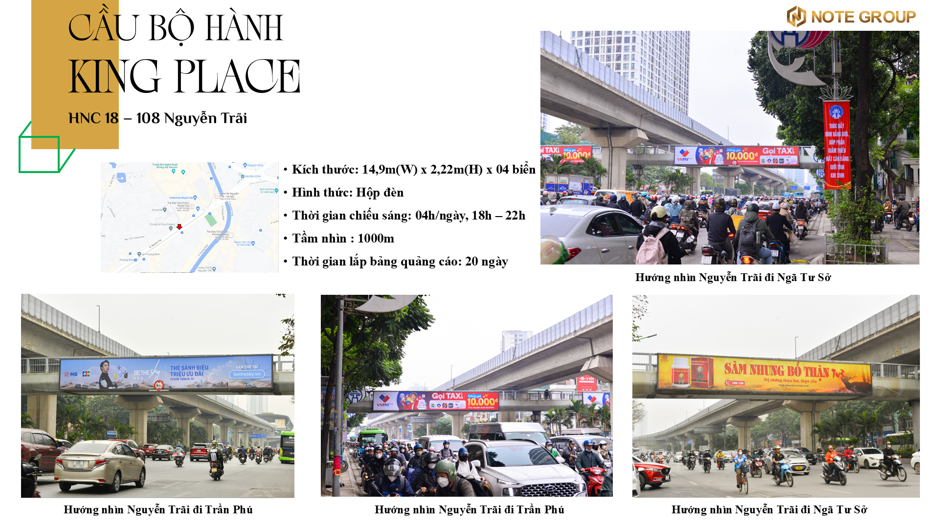 Biển quảng cáo hộp đèn trên cầu bộ hành King Place ở Hà Nội (HNC - 18) tại số 108 đường Nguyễn Trãi, phường Thượng Đình, quận Thanh Xuân, TP. Hà Nội là một vị trí đắc địa để doanh nghiệp tiếp cận hàng nghìn lượt người qua lại mỗi ngày. Với vị trí trên các tuyến đường lớn như Ngã Tư Sở, Tây Sơn, Khuất Duy Tiến,..., cũng là khu nhiều chung cư, văn phòng cao cấp ở Hà Nội như Royal City,...; biển quảng cáo tại đây có nhiều ưu điểm vượt trội, mang lại những hiệu quả cao cho các chiến dịch của khách hàng.