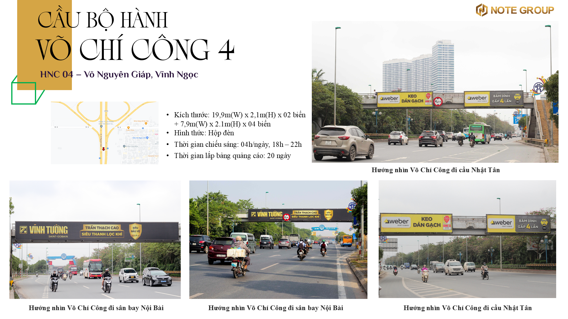 Biển quảng cáo hộp đèn trên cầu bộ hành Võ Chí Công 4 ở Hà Nội (HNC - 04) tại Ngã 4 Cầu Vượt QL5 - Võ Nguyên Giáp, Vĩnh Ngọc, quận Đông Anh, TP. Hà Nội là một vị trí đắc địa để doanh nghiệp tiếp cận hàng nghìn lượt người qua lại mỗi ngày. Với vị trí gần các tuyến đường quan trọng như Cao tốc Nhật Tân - Nội Bài, Võ Nguyên Giáp, Đường Vành Đai 2,..., cũng là khu hướng đến sân bay xung quanh nhiều chung cư, văn phòng, trường học, chợ đầu mối,...; biển quảng cáo tại đây có nhiều ưu điểm vượt trội, mang lại những hiệu quả cao cho các chiến dịch của khách hàng.