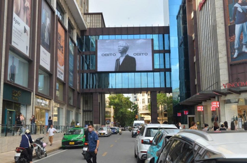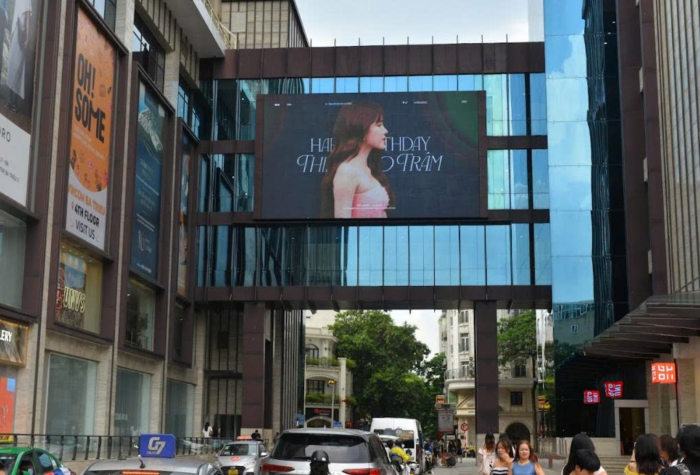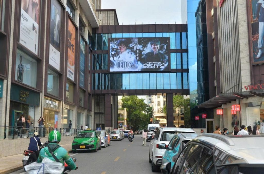 Màn hình LED được lắp đặt trên cầu kính nối liền hai khối trung tâm thương mại Vincom Bà Triệu, nằm ngay phía trên đường Bùi Thị Xuân – một trong những tuyến phố thương mại nhộn nhịp bậc nhất trung tâm Hà Nội. Đây là vị trí cực kỳ đắc địa, có khả năng tiếp cận cưỡng bức với dòng người và phương tiện lưu thông hai chiều mỗi ngày, đặc biệt vào các khung giờ cao điểm.