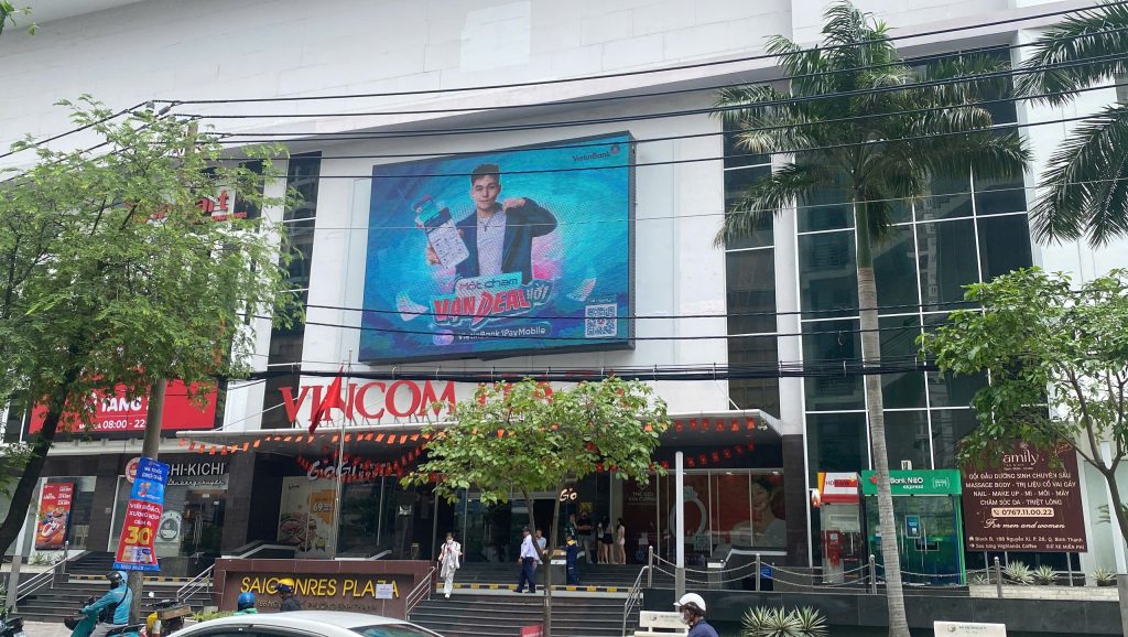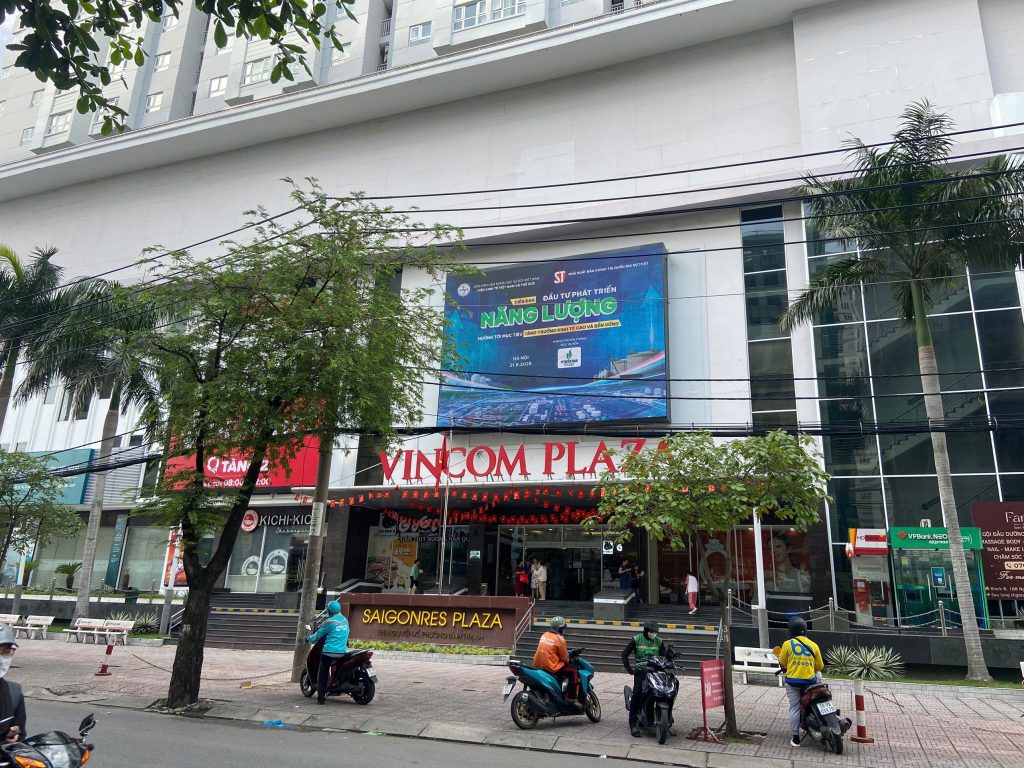 Màn hình LED ngoài trời tại Vincom Plaza SaigonRes được lắp đặt nổi bật ngay phía trên lối vào chính của trung tâm thương mại, thu hút ánh nhìn trực diện từ người đi bộ và phương tiện lưu thông trên tuyến đường Nguyễn Xí – một trong những tuyến đường trọng điểm kết nối Bình Thạnh với các khu vực như quận 1, Thủ Đức và khu dân cư Saigon Pearl.