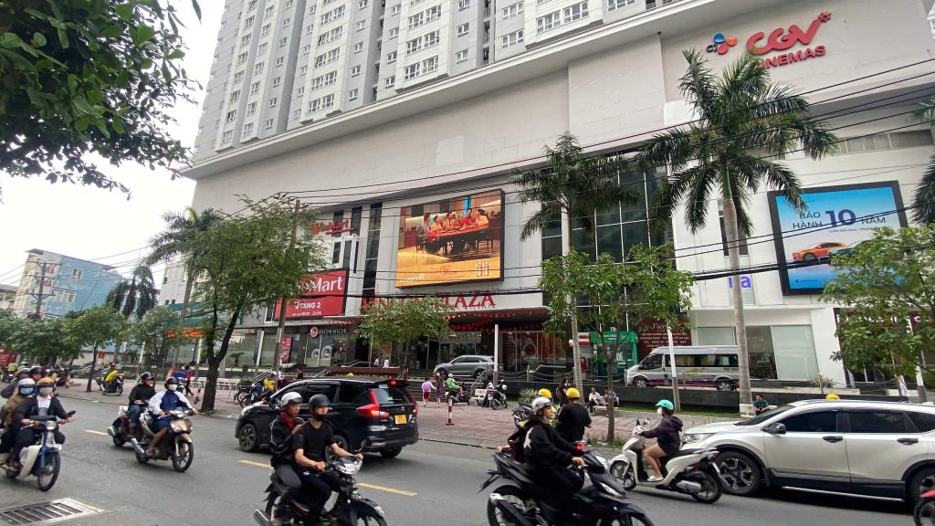 Màn hình đặt ngay trung tâm mặt tiền Vincom, ngang tầm nhìn người đi đường, đảm bảo hiển thị rõ ràng, hiệu quả trong mọi điều kiện thời tiết và thời điểm trong ngày.