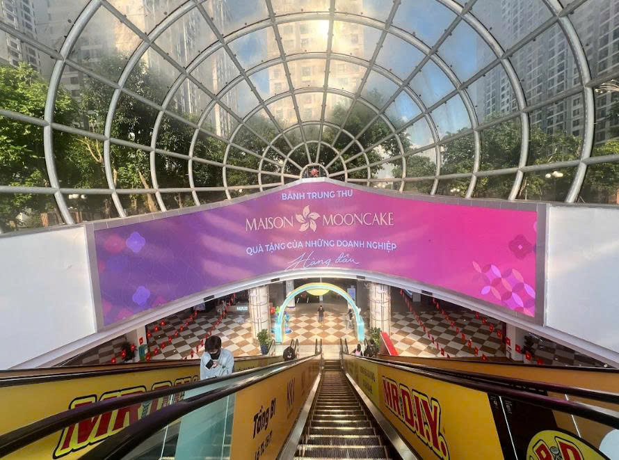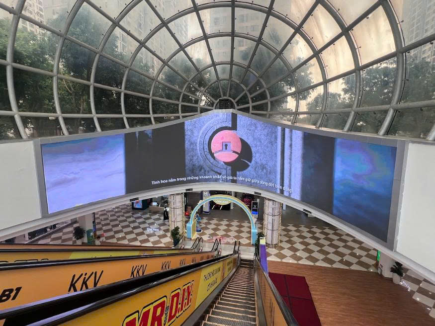Màn hình được bố trí ở vị trí trung tâm tầng 1, tại nơi giao cắt giữa các lối di chuyển chính, thang cuốn và hành lang mua sắm. Đây là điểm nhìn không thể tránh khỏi của bất kỳ ai đi qua khu vực này.