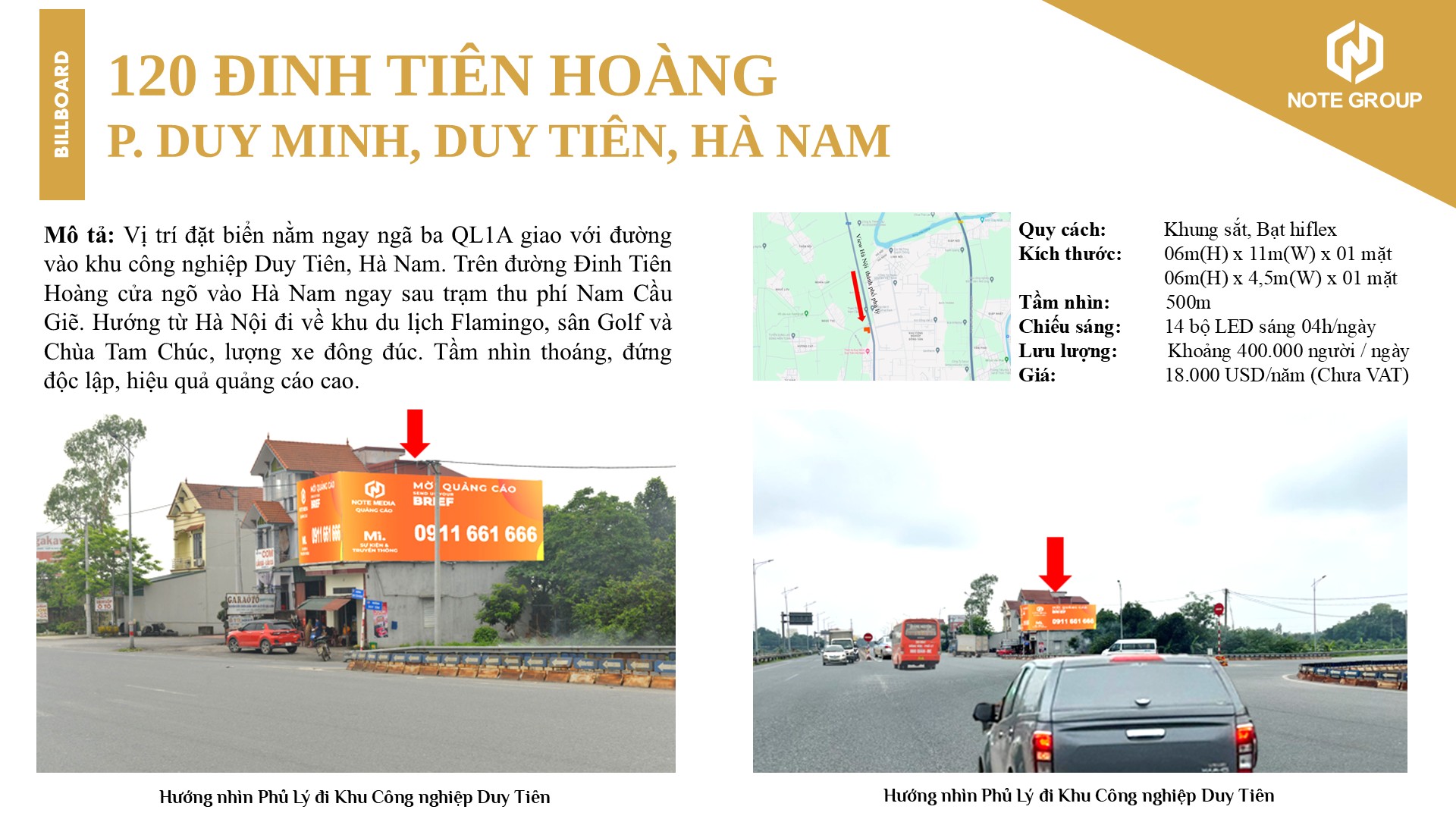 Biển quảng cáo được đặt tại số 120 đường Đinh Tiên Hoàng, ngay ngã ba giao giữa quốc lộ 1A và đường dẫn vào khu công nghiệp Duy Tiên, Hà Nam. Đây là điểm tiếp cận đầu tiên khi vào tỉnh Hà Nam từ hướng Hà Nội, nằm ngay sau trạm thu phí Nam Cầu Giẽ – cửa ngõ chiến lược đón lưu lượng phương tiện lớn mỗi ngày.